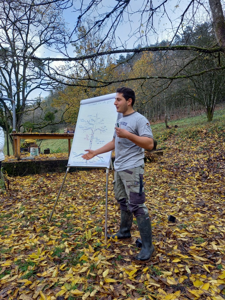 Explication du fonctionnement de l’arbre par Simon, pépiniériste. Il nous a offert ses jeunes greffes de prunier, pommier et cerisier pour l’occasion.