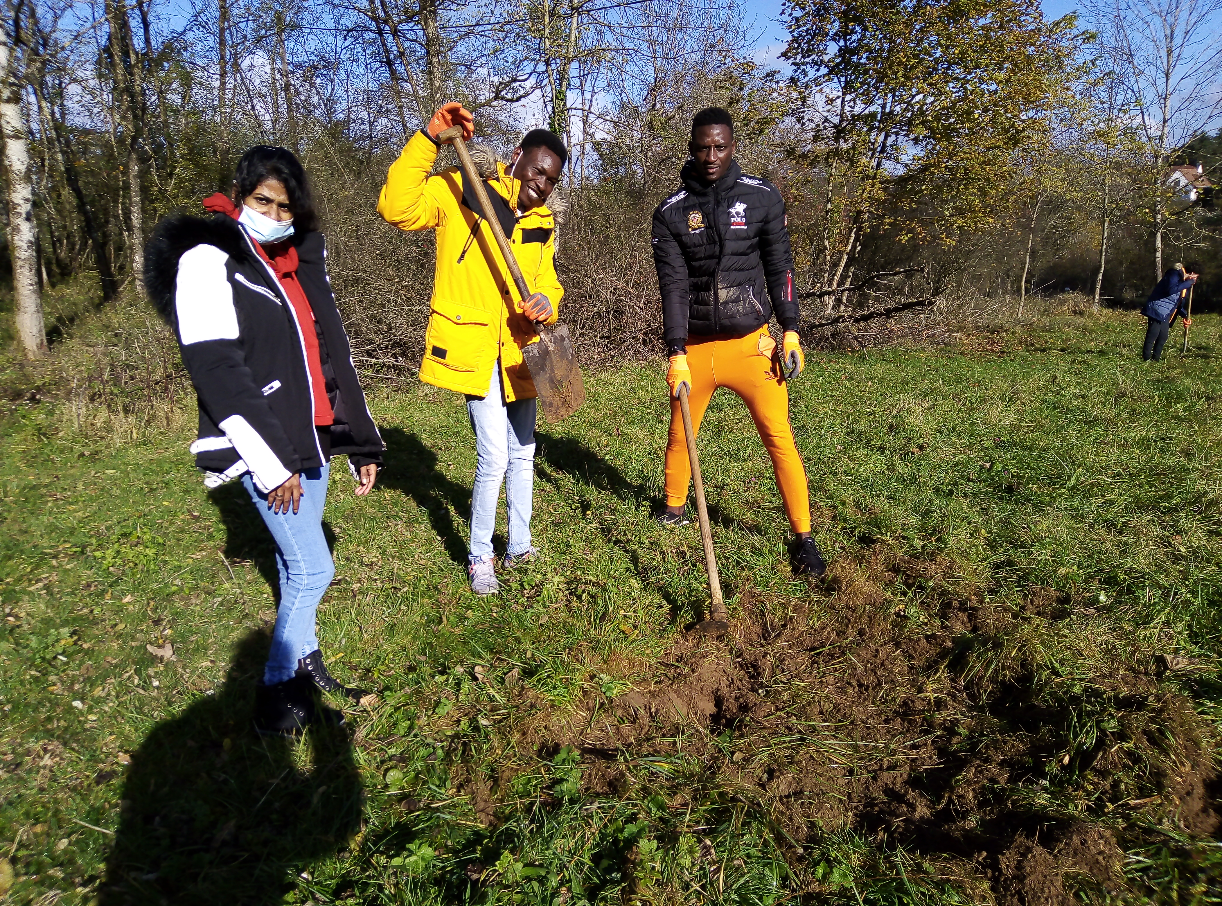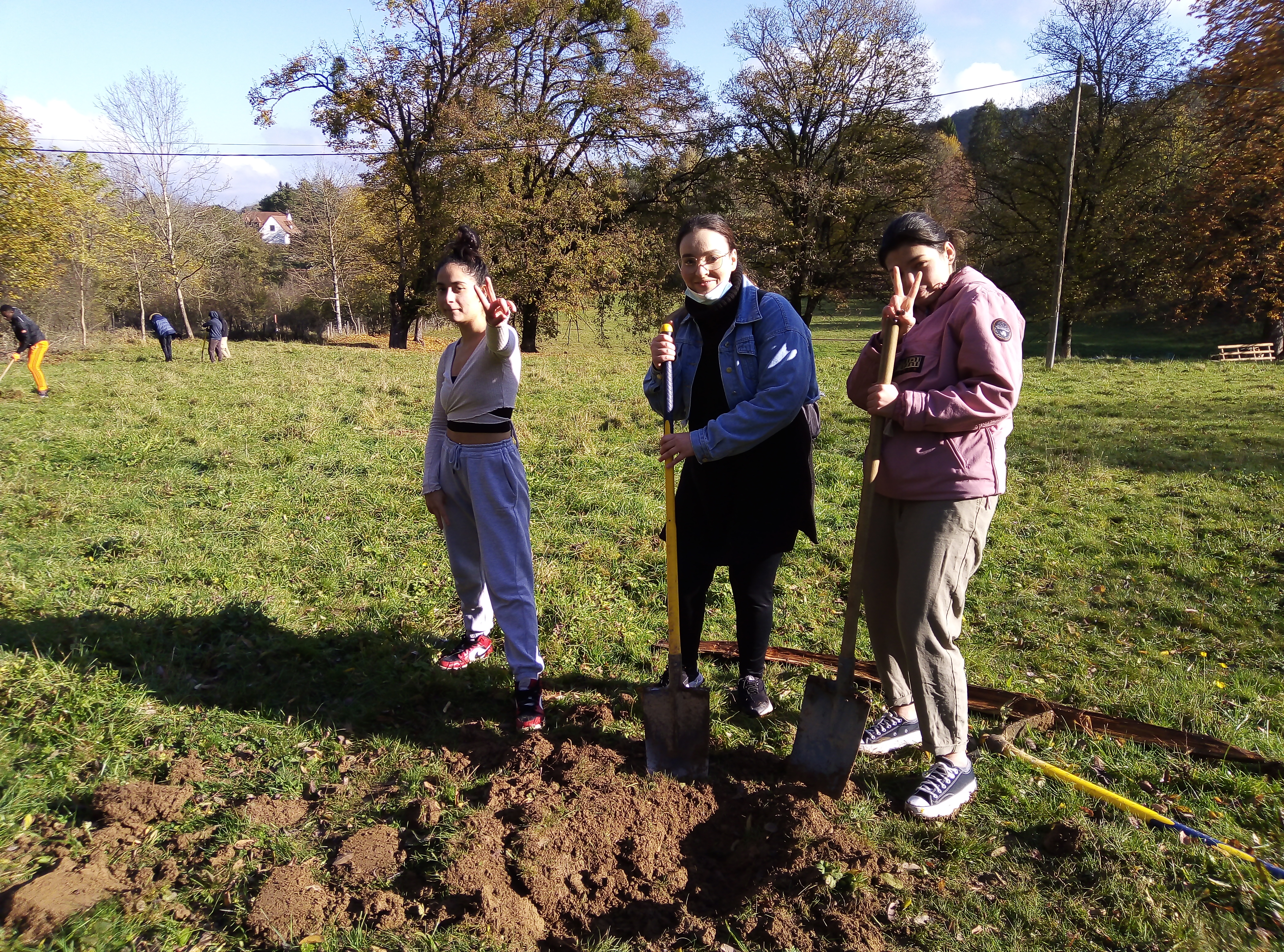 Pelles, pioches, enfonce piquet et un peu d’huile de coude ont été nécessaires pour planter les jeunes arbres qui, on espère, nous offrirons de beaux fruits d’ici quelques années.